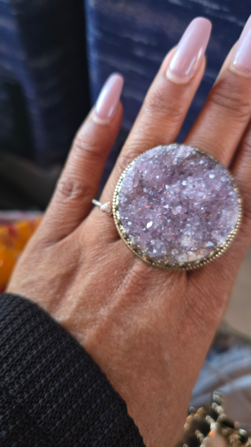 Details: - Natural lavender druzy quartz crystal cluster - Round oversized statement setting - Adjustable ring band for a comfortable fit - Lightweight yet bold statement design - Each stone is one of a kind — no two rings are ever identical - Handmade, artisan-crafted piece